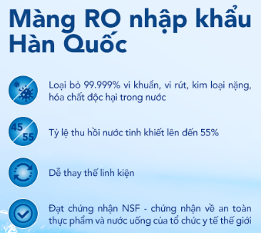 - Màng lọc RO 75 GPD từ Hàn Quốc giúp loại bỏ 99.99% vi khuẩn, vi rút, kim loại nặng, hóa chất độc hại trong nước
