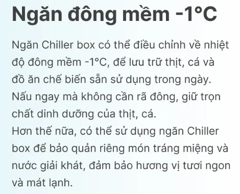 - Ngăn trữ lạnh Chiller Box -1°C giúp ướp lạnh thức uống nhanh, bảo quản thực phẩm tươi sống như thịt, cá,...
